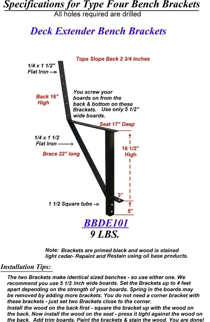 These BENCH BRACKETS bolt to the side and top of your deck and extend over the edge of your deck. This make small decks larger and large decks enormous. You can make a corner without a corner bracket. These are strong, durable brackets and are just the thing for smaller decks. Paint is a black primer.